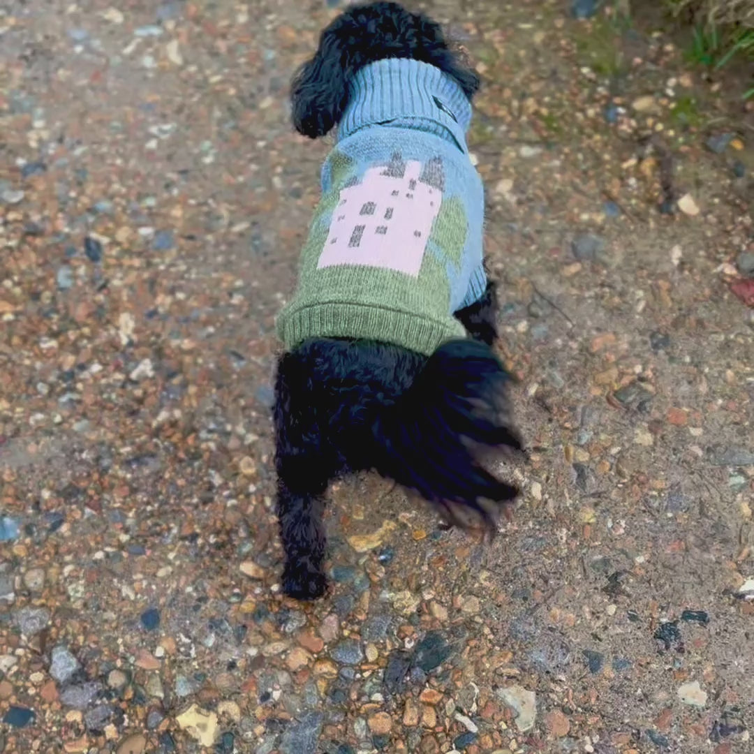 Discover the magic of Scotland's most enchanting castle in wearable form. This British wool dog jumper draws inspiration from Craigievar Castle's legendary pink turrets, a fairytale fortress nestled in Aberdeenshire that captivates all who see it. Charlotte Godfrey's exclusive artwork transforms this iconic Scottish landmark into an original knitted design that's both whimsical and timeless. Crafted entirely in the UK from premium British wool with labels woven in Scotland, this jumper celebrates heritage craftsmanship while keeping your beloved companion cosy and stylish. A truly distinctive piece that tells a story.